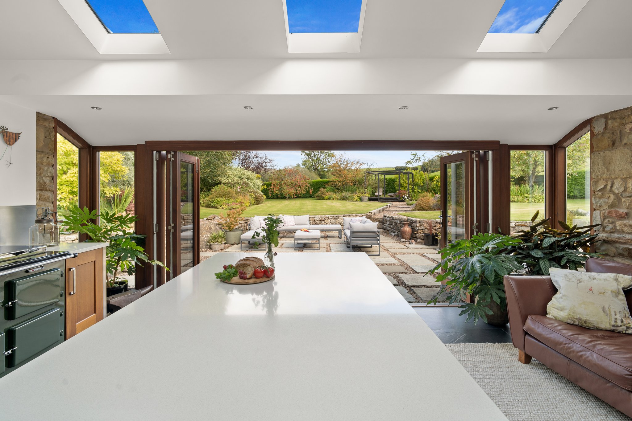 • Spacious Open-Plan Kitchen And Dining Area With Walnut Cabinetry, Quartz Worktops, AGA, Central Island, And Bi-Fold Doors To The Garden.